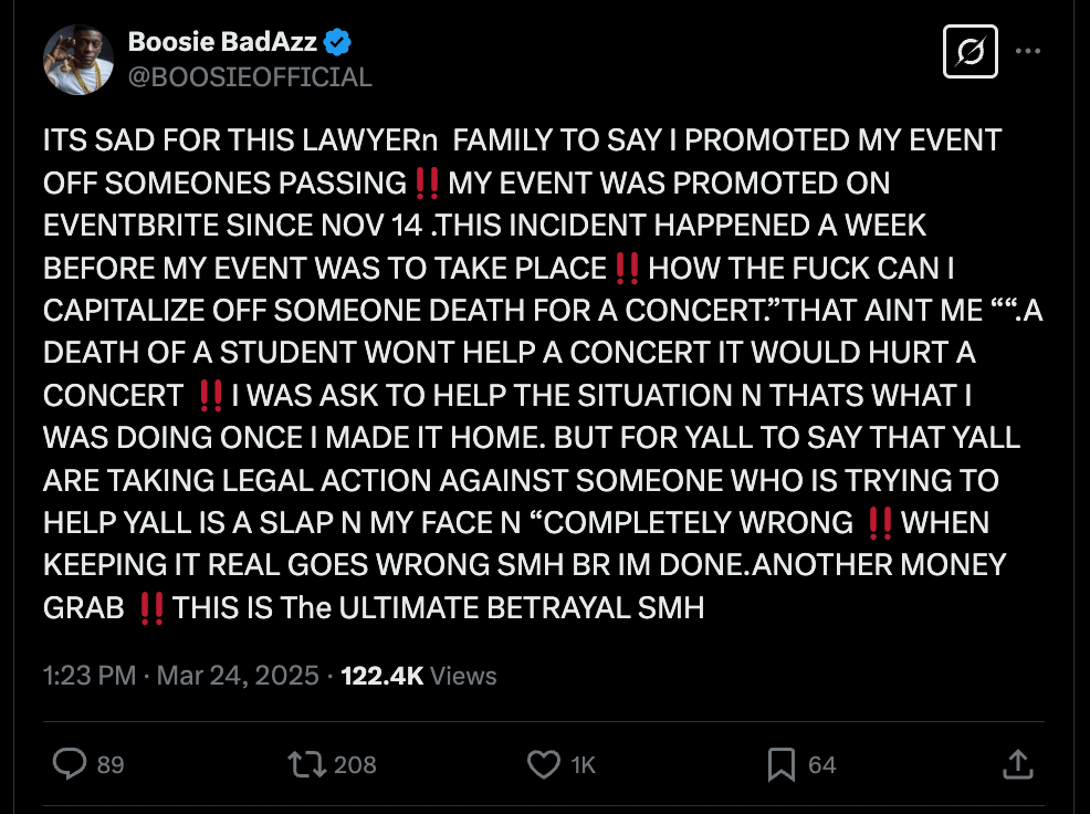 In response, Boosie took to social media to express his frustration and intent to counter the legal threats. He emphasized that his event had been planned and promoted well before Wilson’s untimely death, making it impossible for him to have exploited the tragedy for promotional purposes. Boosie stated, “MY EVENT WAS PROMOTED ON EVENTBRITE SINCE NOV 14. THIS INCIDENT HAPPENED A WEEK BEFORE MY EVENT WAS TO TAKE PLACE?? HOW THE F*CK CAN I CAPITALIZE OFF SOMEONE DEATH FOR A CONCERT. ”THAT AINT ME.”“