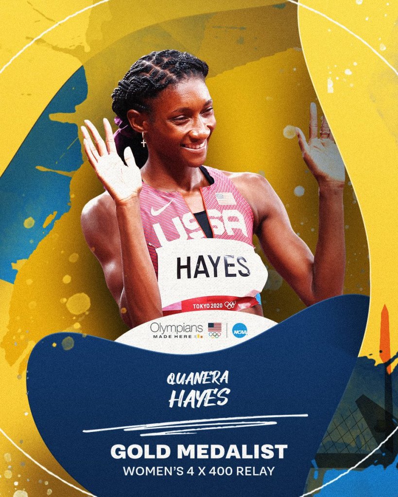 Quanera Hayes won a gold medal as part of Team USA’s victory in the 4x400m women’s relay. Hayes ran a 51.27 split on the first leg to help the team advance to the gold medal round.