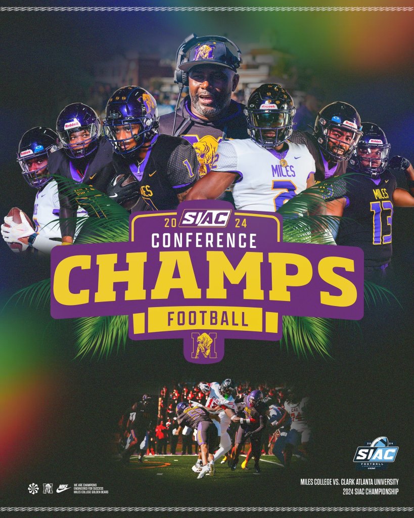 The Golden Bears finished a perfect romp through the conference schedule with a 53-25 win over Clark Atlanta in the 2024 SIAC Championship Game on Saturday at Sloan-Alumni Stadium. In the process, Miles College (9-2) won its fifth SIAC title during the Division II era (since 1987) in a game that the team never trailed. It was the ninth consecutive win for the Golden Bears, which ties the school record for wins in a single season and sets the school mark for consecutive victories in a single campaign.