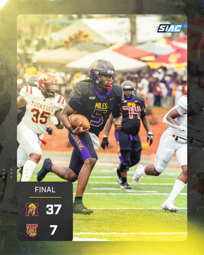 The victory was the eighth straight this season for Miles College (8-2, 8-0 SIAC) and capped the program’s first undefeated romp through the Southern Intercollegiate Athletic Conference in more than 40 years as a Division II institution. The win streak now matches the longest in-season run in the program’s modern history. Just as impressive, it is the fifth win in seven tries at Tuskegee (5-5, 5-3) since 2011, with three of them coming on TU’s Homecoming.